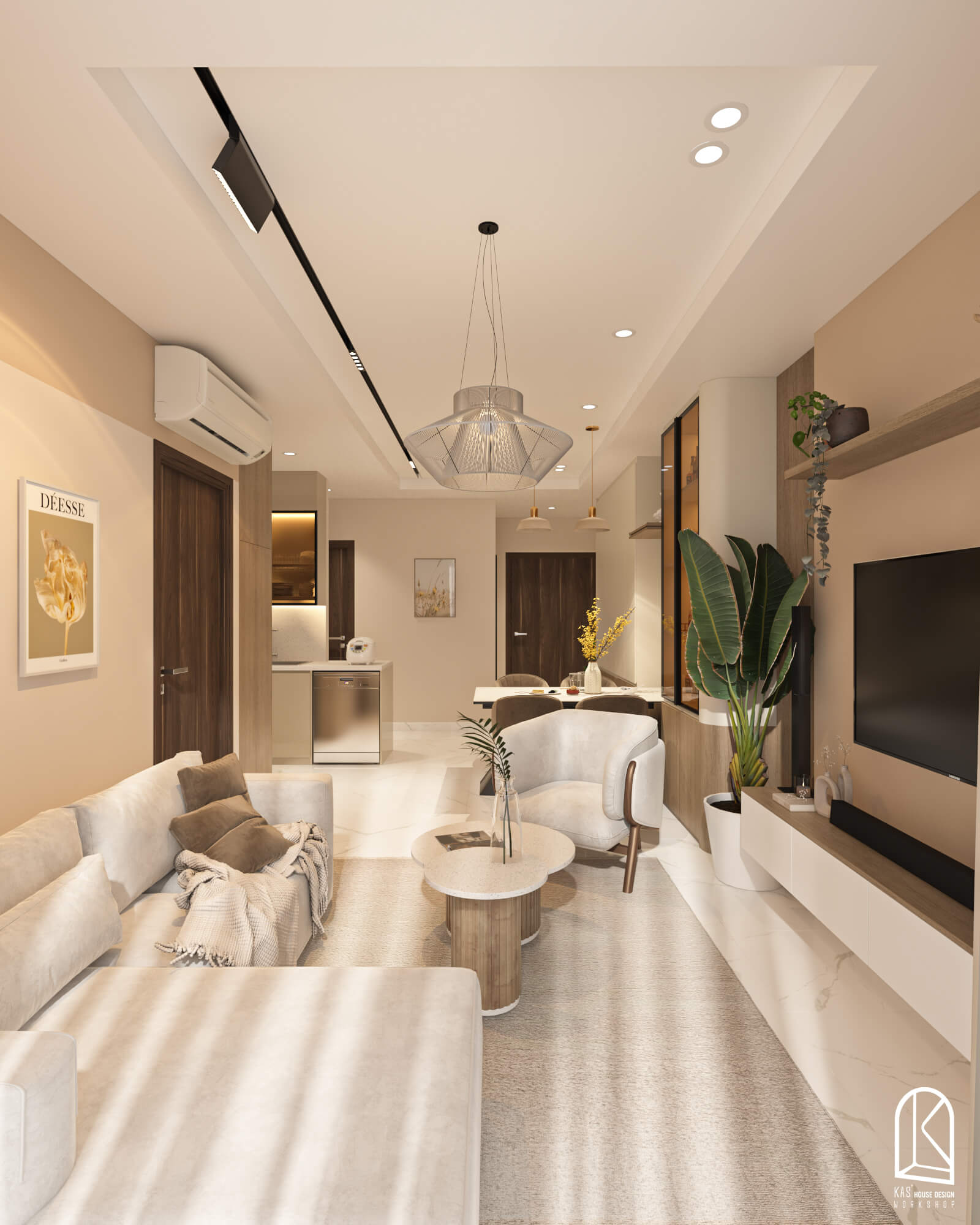 Vì vậy sau khi tìm hiểu rõ nhu cầu của anh chị, Kas không tập trung vào việc trang trí quá nhiều mà đã tận dụng triệt để không gian để làm các tủ ẩn âm tường, mọi đồ vật đều phải có chỗ cất giữ riêng cho nó. Phong cách thiết kế mang màu sắc hiện đại pha lẫn một vài món đồ Wabi Sabi để căn hộ trông gần gũi và ấm cúng hơn.Chắc hẳn sau khi hoàn thiện, đây sẽ là một tổ ấm mới hoàn hảo cho anh chị cùng 2 cô con gái nhỏ.