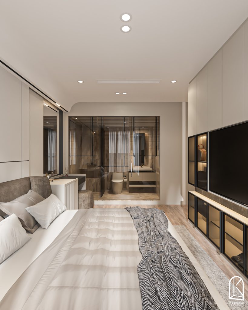 Phòng master cũng trở nên rộng hơn khi dời hệ tủ áo sang khu vực hành lang. Wc master kết nối với phòng ngủ bằng vách kính xám khói làm tăng sự thông thoáng tầm nhìn. Vách tivi cũng được tận dụng kết hợp làm hệ tủ túi xách.