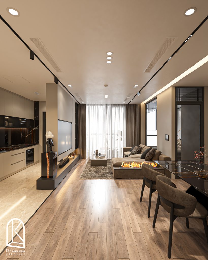 Kas phá bỏ bức tường ngăn cản tầm nhìn giữa phòng khách và bếp, mở rộng chiều ngang phòng khách. Vách sofa được Kas thay bằng hệ nhôm kính kết hợp rèm để không gian được thoáng hơn.